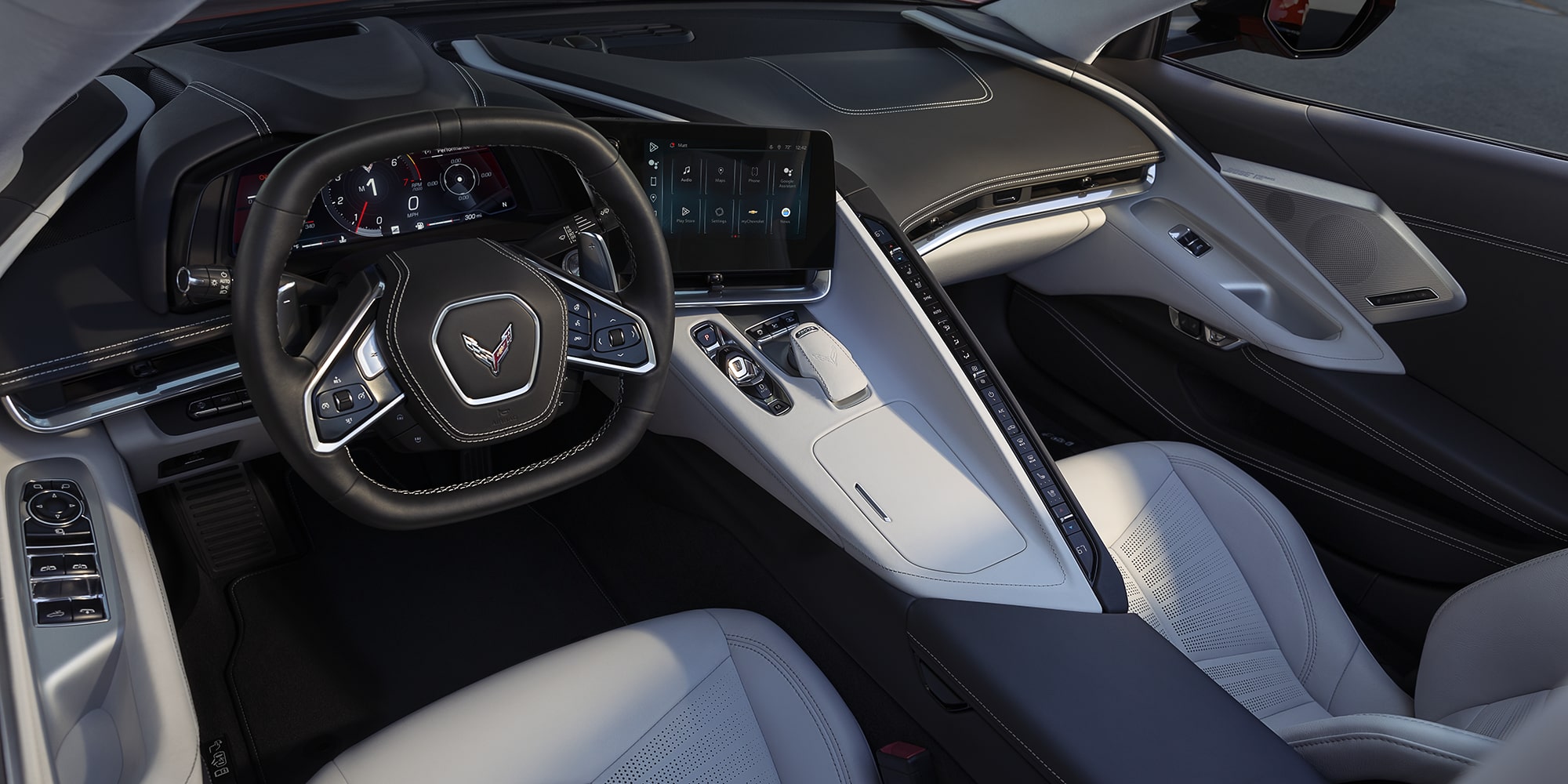 Your options for the interior are even more robust at 21 colors. Premium leather upholstery is standard across the trim levels, too. Tightness is the name of the game because you need to stay in control. The Vette features a squared-off steering wheel with leather wrapping. The digital instrument panel and infotainment screens angle toward the driver for a maximally jet fighter-style experience. With only two seats, the Corvette allows you to take one passenger for the ride of their life.